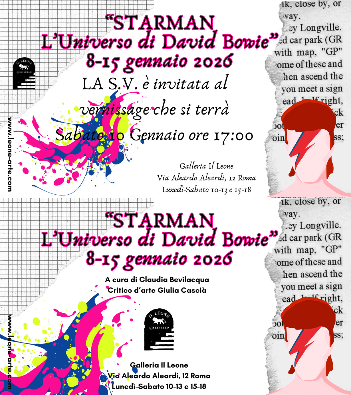 The Gallery opens the new year with the international group exhibition STARMAN – THE UNIVERSE OF DAVID BOWIE Ten years after his passing, a group exhibition pays tribute to David Bowie – a total artist, pioneer of music and identity, and a figure who revolutionized contemporary cultural imagery. A visual and conceptual homage to one of the most groundbreaking icons of our time: David Bowie, a chameleonic artist, intergalactic poet, and explorer of identity and sound. Hosted inside Galleria Il Leone, a space historically dedicated to arti… Each artwork is a personal interpretation, a tribute, or a critical re-reading that testifies to the ongoing influence of his figure on new generations of artists. The show features 25 works by 19 contemporary artists, each inspired by a different aspect of Bowie’s universeSTARMAN – The Universe of David Bowie will be open from January 8 to 15, 2026.