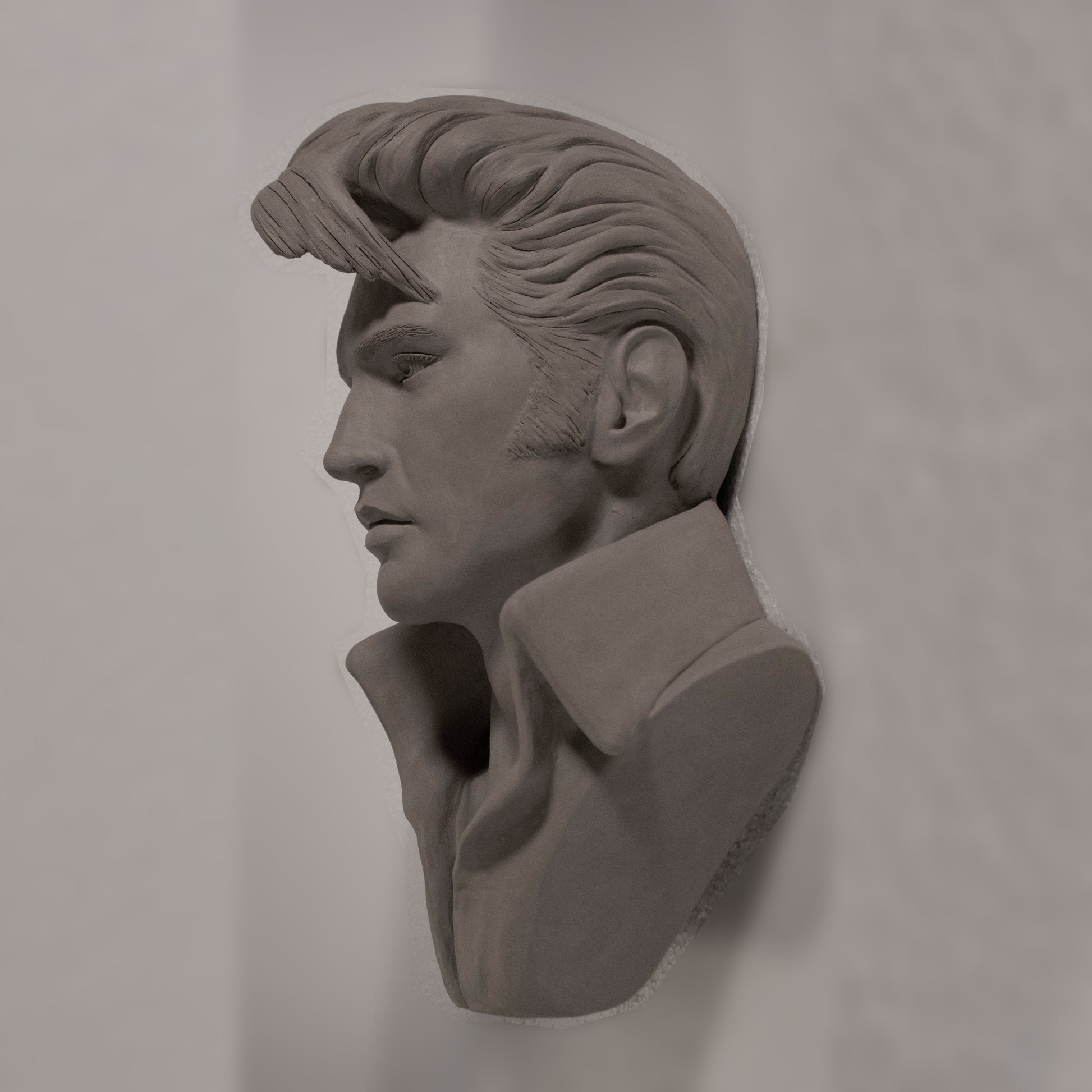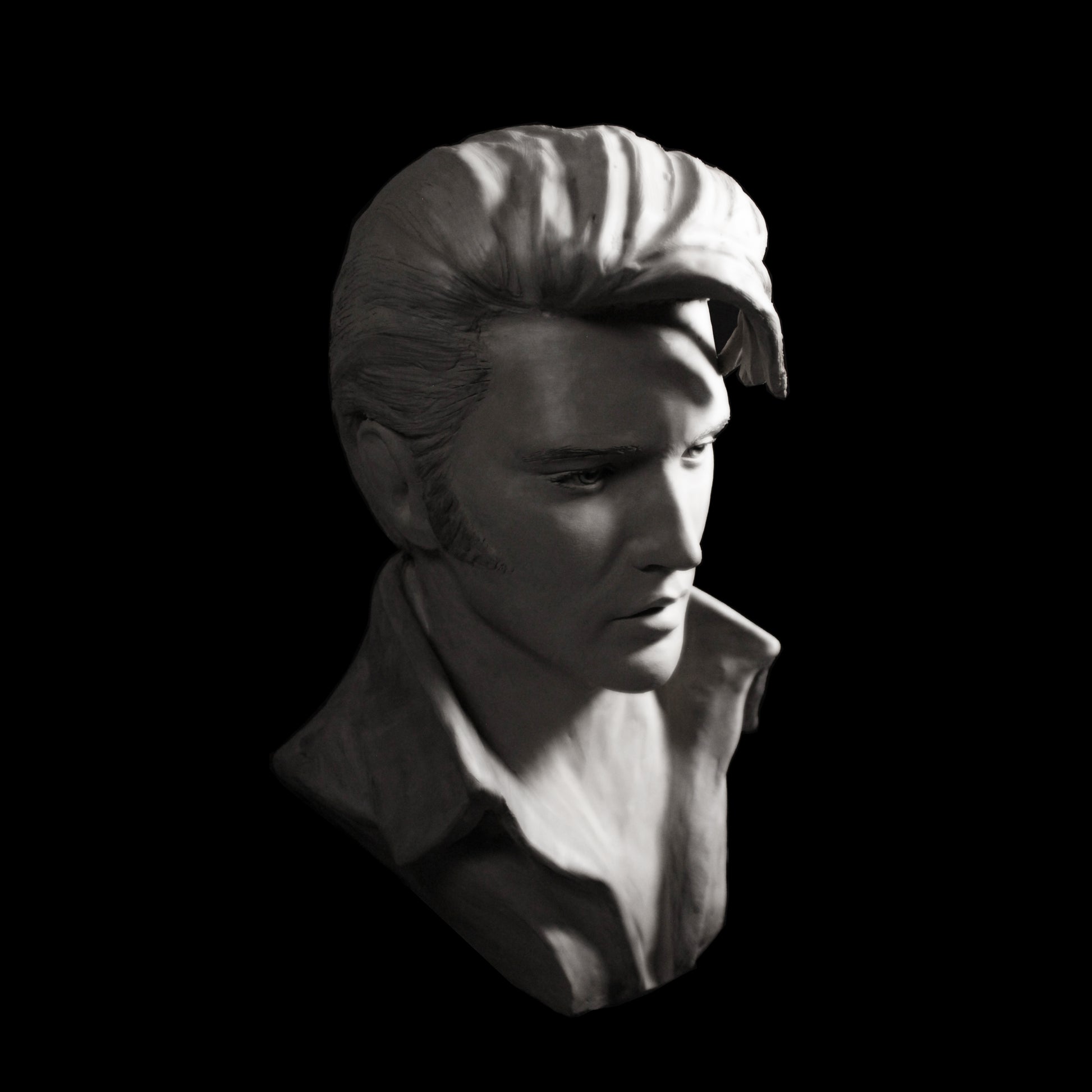 This Bust in the photo is inspired by Elvis Presley photoshoot in the 'Comeback Special 1968' is made of white fresh clay. You can see a painted version to this link Elvis 1
